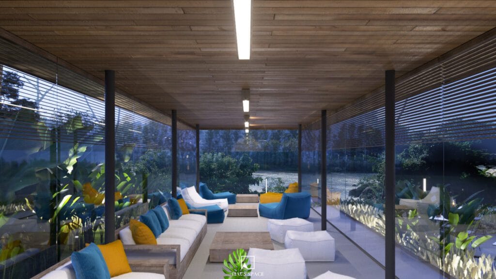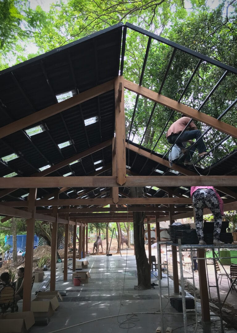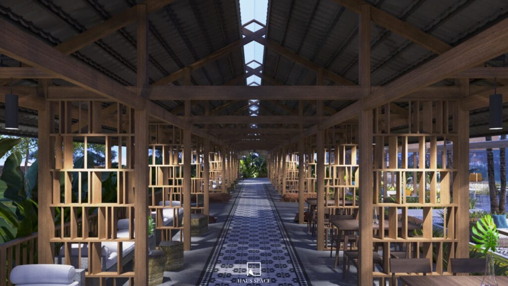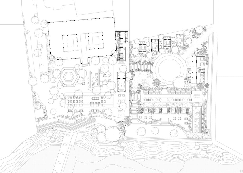 The new Cafe draws upon the palette of existing materials and typological forms of the Pho Da cafe, including a long roof by using a modest steel structure and cement tiles. The main support system replicates the familiar wood frame observable at the current restaurant. The cafe space has different degrees of openness and enclosure. The dining outlook focuses toward the river and activities along it. It provides the guests with the usual comforts yet does not take away their intimate connection with nature.